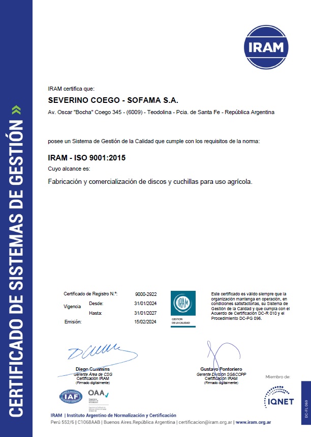 La certificación ISO 9001:2015 en la fabricación y comercialización de discos y cuchillas para uso agrícola, completa las condiciones óptimas de atención al mercado nacional e internacional, abasteciendo a más de 14 países, convirtiendo la marca en sinónimo de calidad.